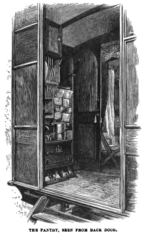 When breakfast is wanted in a hurry, to ensure an early start, the cooking is done the night before, and the tea made and poured off the leaves into a large bottle, so that five minutes’ time in the morning is sufficient to warm everything. The oil for the range is hung underneath in a can.