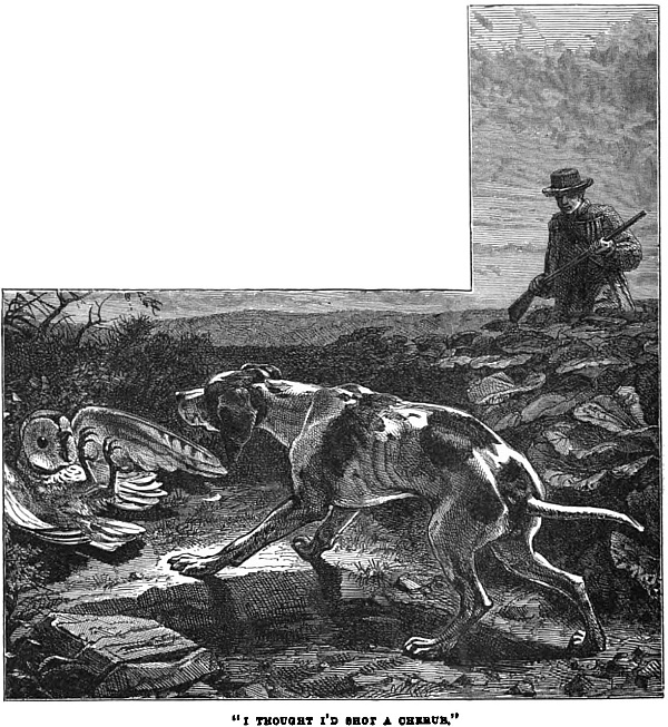 “No,” replied Frank; “I only remember one owl, and I don’t know which of the two of us had the bigger fright—Ponto the pointer, or myself. I had killed nothing that day but one old rook, a few field-mice, and a snake or two, and we were coming home in the dusk, when some great bird flew heavily out of the ivy-covered old tree near the churchyard. ‘Down you come, whatever you are,’ says I; and bang! bang! went both barrels. He flew a goodly way, but finally fell; and off went Ponto, and off went I in search of him. Ponto was in a way, I can tell you; he wasn’t pointing half prettily. ‘Hoo! hoo! hoo!’ the owl was screaming. ‘Come a bit nearer, and out come both your eyes.’ ‘I’ll stand here, anyhow,’ Ponto seemed saying, ‘till master comes up.’ Well, Chisholm, when I came up and saw the creature, it looked so like one of the winged images you see on tombstones, that, troth, I thought I’d shot a cherub of some sort.”