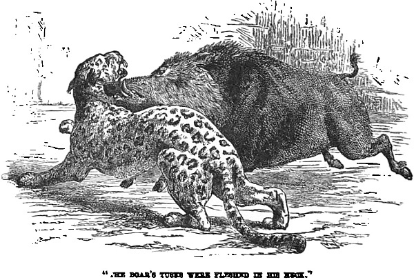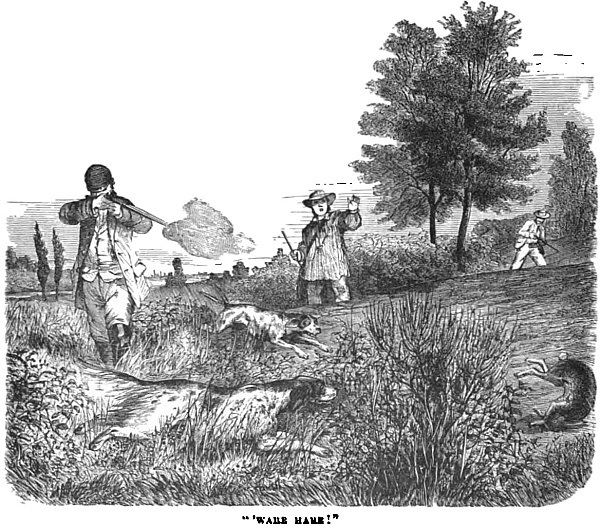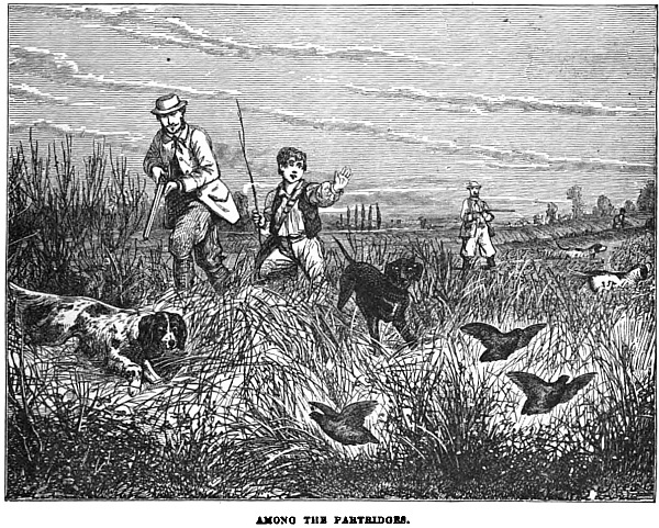 “Gearge,” the farmer’s man, went with them every day to help to carry the rabbits our sportsmen killed. On the other hand, there were boys in the rear to help Gearge. Besides Gearge and the boys, there were two dogs—a beautiful setter and a pointer, but good useful country dogs—dogs that did not think it beneath their dignity to retrieve as well as set and point. The most curious part of the whole business to young Frank, was the fact that these dogs knew a hare from a rabbit at first sight far better than he did. Well, to a young sportsman, to see a beautiful hare pass within easy shooting distance was a great temptation to fire. Frank had his doubts whether Gearge always knew one from the other, or t’other from which, because, no matter what it was, if Gearge saw only a bit of brown fur flitting from one bush to another, he sang out in stentorian tones, “’Ware hare.”