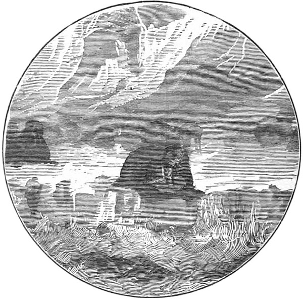 “Well was it for us we had lashed our frail canoes together, for there was one portion of the great river which it was dangerous to descend, even in fine weather, so rapid was the current. When we reached this place the storm was at its very worst, and we found ourselves suddenly whirling along in the midst of a raging cataract, a boiling surging cataract. The thunder seemed rending the forest, and the very rocks around us; the rain was terrible, and I had never seen such lightning before; forked and sheet I had been used to, but here great balls of fire fell from heaven, splitting, and hissing as they reached the waves. It was indeed a fearful storm. When we reached camp at long last, we expected to find that our horses had broken loose in the extremity of their terror, but we were greatly mistaken; here they were safe enough, and although there was evidence in the state of the ground that they had been at first alarmed, they were quiet now; ay, even cowed in their joy to see us, they fawned upon us almost as a dog would have done.