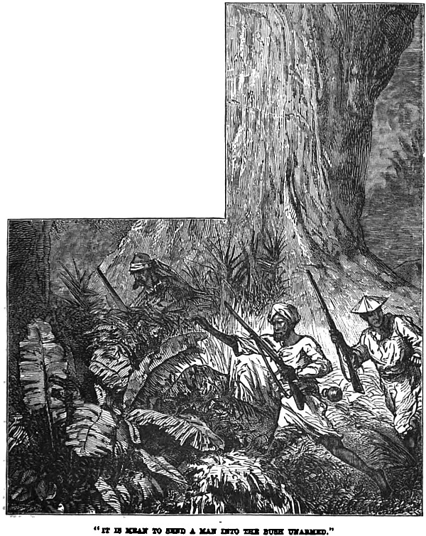 The men in the fort were thirty in all; their rifles were twenty. Twenty rifles against a hundred spears, the odds were not so overwhelming; but those Indians are terribly cunning in their mode of warfare, as our heroes soon found out, for small balls of burning grass, thrown sling-fashion, attached to a stone and rope of skin, soon began to fall thick and fast into the garrison.