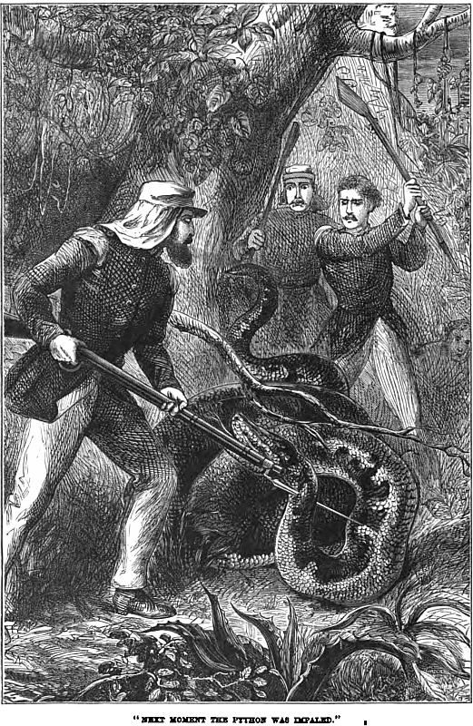 There was something about Fred Freeman which is difficult to describe, but which caused everybody to like him. He had the manners of a high-bred English gentleman, but that did not, of course, constitute the something that made him a favourite, because bon ton, manners are happily not rare. However, there’s no harm in my trying to describe him to you, because he is one of our three heroes. Fred wasn’t much, if any, above the middle height; he had a short dark beard and moustache—they were not black, however. He was very regular in features—handsome, in fact, handsome when he was in his quiet moods, which he very frequently was, and even more so when merry, for then he was simply all sunshine, and it made you laugh to look at him. He was very unobtrusive. He was a capital shot, and a daring hunter and sportsman, but never boasted about his own doings. His constitution was as tough as india-rubber, and as hard as nails. If there be anything wanting in this description, the reader must supply it himself. Anyhow, Fred was a genuine good fellow. He had hitherto travelled a good deal, sport-intent, chiefly on the Continent; but he jumped at the proposal to go round the world on “a big shoot,” as he called it.