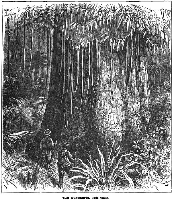 “This did not quite tire Jack and me of adventure and travel. No; we just worked for a year, and then, once more accoutring ourselves, we made tracks for the mountain-forests. The gold fever had broken out, and we had caught it, only we determined to go prospecting all by our two selves. And a good thing we did. We built ourselves a house. Jack called it ‘the little hut among the bushes.’ Some of the bushes, gentlemen, were three hundred feet in height. We found gold, too. Fact is, we had a small mine all to ourselves. As soon as we made a pile, we used to go south, disguised as poor trappers, to sell our skins and fill our powder-flasks; but, in reality, to bank our gold.