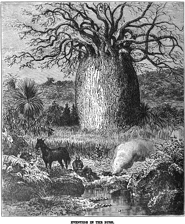 “Well, gentlemen, after this I was just as anxious to get away from England as Jack was, so we made our preparations; and in a month’s time we had crossed the wide Atlantic, and journeyed as near to the Rocky Mountains as cars would take us. I don’t think we had either of us any very definite notion of what we should do, or what adventures we should meet with. We were not unprepared, however, for anything. We had not gone abroad with our fingers in our mouths, so to speak; but we had read books on travel, and taken the best advice on everything. We had good horses, good waggons, good guns and compasses, and a fair supply of the necessaries of life, to say nothing of a trusty guide. So we just set a stout heart to a stiff brae (hill), and began the march. ‘To the west’ was our watchword; and there was in all our wanderings, ever in our hearts, the reflection of a sweet dream, which we firmly believed would one day become a reality, namely, that we would fall in with some land of gold, make riches in time, and then return to our own country.
