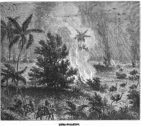 Chisholm wanted one day to go ostrich-stalking, or rhea-hunting you might better term it. These curious birds are as fleet as the wind, you cannot ride them down in the open; but you can approach them near enough with mules, to get a shot when fires are lit here and there on the plain, and the creatures get confused. It had been a long day’s sport; and the moon had arisen, and was flooding all the beautiful country with its soft and mellow light, ere the party had got within two leagues of the estancia. But they knew the welcome that there awaited them, and so on they rode, slowly but cheerfully, singing as they went. There would have been less music at their hearts, had they seen the expression of mingled hate and cunning on the faces of those fiends behind the cactus bush. What were they lurking there for? Why did they not come boldly forth?