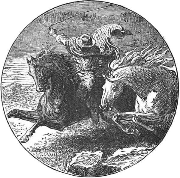 “I hardly heard the last word. I had struck the spurs into my own good mare, and was off like a meteor. I could see the lady’s terrible danger. She was heading for an awful precipice. I saw I might intercept her if I crossed her bows, as a sailor would say. It was a ride for life—we near each other, riding swift as arrows. Onward she comes—onwards I dash, and we are barely fifty yards from the Furies’ Leap, when our horses come into collision with fearful force.