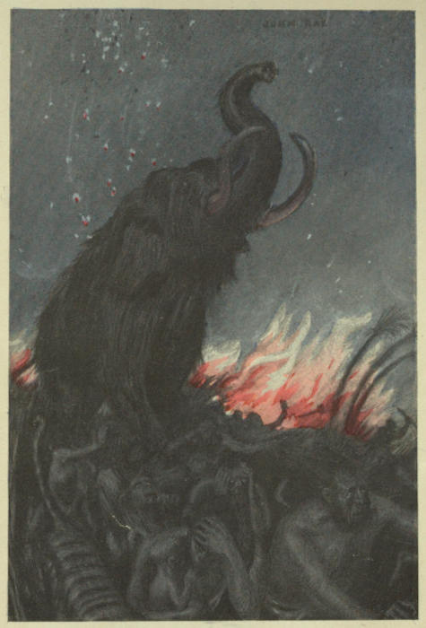 Then came the rain, but not in drops and jets. Its fall was more like that of a[238] solid, and the whole earth rose in smoke to meet it. The blackness was now like the blackness of night, and a man could no longer see the distance that is between two trees standing in a thick forest.