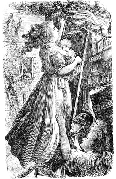 Anxiety and grief did not prevent Perez attending to his business; but either from the many drains upon his little capital, or that trade was just at that time in a very low state, his prosperity had begun visibly to decrease. And not long afterwards a misfortune occurred productive of much more painful affliction than even the loss of property which it so seriously involved. A dreadful fire broke out in the neighbourhood, gaining such an alarming height ere it was discovered, that assistance was almost useless. Amongst the greatest sufferers were Perez and his family. Their happy home was entirely consumed, and all the little valuables it had contained completely destroyed. Perez gazed on ruin. For one brief moment he stood as thunderstricken, but then a terrible shriek aroused him. He looked around. He thought he had seen all whom he loved in safety, but at one glance he saw his little Ruth was not there. His wife had caught a glimpse of the child in a part of the building which the flames had not yet reached, and with that wild shriek had flown to save her. He saw her as she made her way through falling rafters and blazing walls; he made a rush forward to join and rescue or die with her; but his children clung round him in speechless terror; his friends and neighbours seconded them, and before he could effectually break from them, a loud congratulatory shout proclaimed that the daring mother had reached her child. A dozen ladders were hurried forward, their bearers all eager to be the first to plant the means of effectual escape; and clasping her Ruth closely to her breast, regardless of her increasing weight (for terror had rendered the poor child utterly powerless), the mother’s step was on the ladder, and a hush fell upon the assembled hundreds. There was no sound save the roar of the devouring element and the play of the engines. The flames were just nearing the beam on which the ladder leaned, but hope was strong that Rachel would reach the ground ere this frail support gave way; and numbers pressed round, regardless of the suffocating smoke and heat, in the vain hope of speeding her descent.