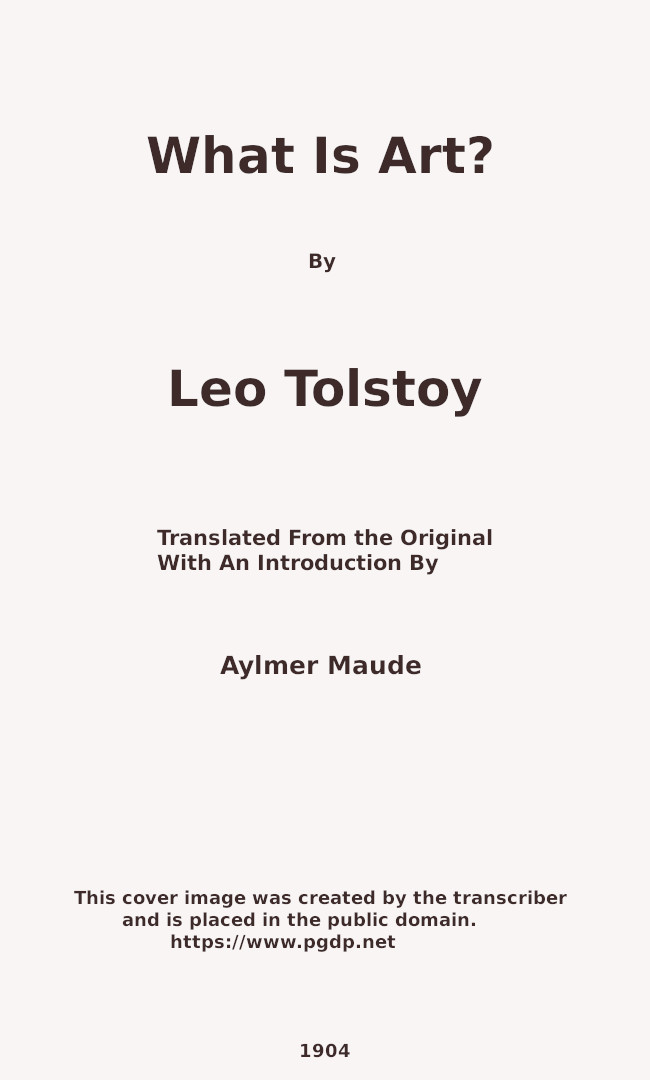 The basis on which this work rests, is a perception of the meaning of human life. This has been quite lost sight of by some of the reviewers, who have merely misrepresented what Tolstoy says, and then demonstrated how very stupid he would have been had he said what they attributed to him. Leaving his premises and arguments untouched, xivthey dissent from various conclusions—as though it were all a mere question of taste. They say that they are very fond of things which Tolstoy ridicules, and that they can’t understand why he does not like what they like—which is quite possible, especially if they have not understood the position from which he starts. But such criticism can lead to nothing. Discussions as to why one man likes pears and another prefers meat, do not help towards finding a definition of what is essential in nourishment; and just so, “the solution of questions of taste in art does not help to make clear what this particular human activity which we call art really consists in.”