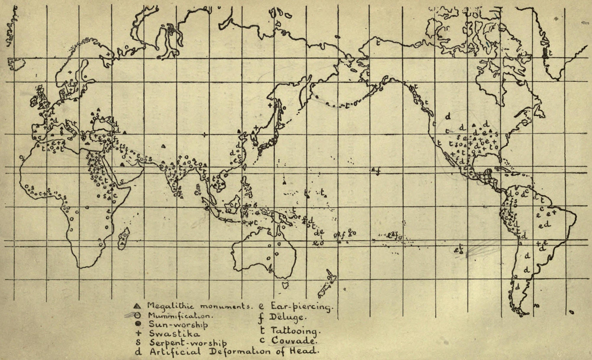 If a map of the world is taken and one plots out (Map I.) the geographical distribution of such remarkable customs as the building of megalithic monuments (see for example Lane Fox’s [Pitt Rivers’] map, 20), the worship of the sun and the serpent (51; 103), the custom of piercing the ears (see Park Harrison, 29), tattooing (see Miss Buckland, 10), the practice of circumcision, the curious custom known as couvade, the practice of massage, the complex story of the creation, the deluge, the petrifaction of human beings, the divine origin of kings and a chosen people sprung from an incestuous union (W. J. Perry), the use of the swastika-symbol (see Wilson’s map, 105), the practice of cranial deformation, to mention only a few of the many that might be enumerated, it will be found that in most respects the areas in which this extraordinary assortment of bizarre customs and beliefs is found coincide one with the other. In some of the series gaps occur, which probably are more often due to lack of information on our part than to real absence of the practice; in other places one or other of the elements of this complex culture-mixture has overflowed the common channel and broken into new territory. But considered in conjunction these data enable us definitely and precisely to map out the route taken by this peculiarly distinctive group of eccentricities of the human mind. If each of them is considered alone there are many breaks in the chain and many uncertainties as to the precise course: but when taken together all of these gaps are bridged. Moreover, in most areas there are traditions of culture-heroes, who brought in some or all of these customs at one and the same time and also introduced a knowledge of agriculture and weaving.