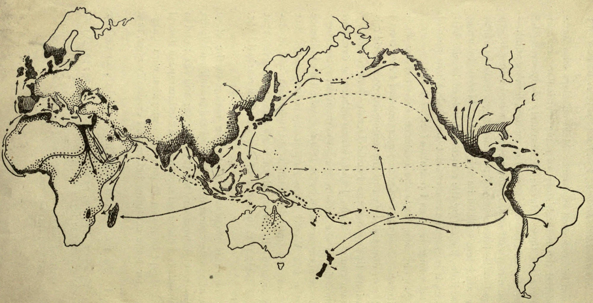 No one who reads the evidence collected by such writers as Ellis (15), de Quatrefages (60) and Percy Smith (98)[3] can doubt the fact of the extensive prehistoric migrations throughout the Pacific Ocean along definitely known routes. Even Joyce (whose otherwise excellent summaries of the facts relating to American archæology have been emasculated by his refusal to admit the influence of the Old World upon American culture) states that migrations from India extended to Indonesia (and Madagascar) and all the islands of the Pacific; and even that “it is likely that the coast of America was reached” (61, p. 119).[4]