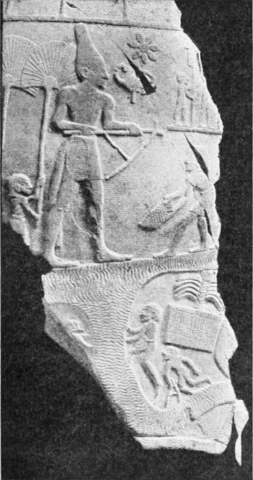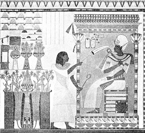 The little information we possess of his reign is derived mainly from the inscriptions upon the Theban temples restored by him after his return to the orthodox faith, though many of these records are palimpsests, for Horemheb replaced Tutankhamen’s name on most of them. The two other chief sources of information are: (a) the piece of linen found in 1907, which is the only certain evidence that he reigned as long as six years; and (b) a remarkably interesting series of wall-pictures in the tombs of Huy at Kurnet (Murrai), which afford the only record we have of Tutankhamen’s relations with Ethiopia and Asia. These pictures are among the most familiar records of ancient Egyptian life, having been used by Champollion, Lepsius, Brugsch and Piehl, and the inscriptions describing the scenes have been translated into English by Professor Breasted.[1]
