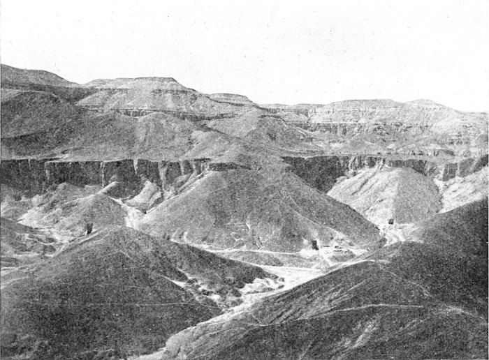 The work of modern exploration of the Valley of the Tombs of the Kings can be said to have begun in 1819 when the traveller Belzoni opened and wrote a description of the tomb of Seti I. In 1881 the discovery was made of a collection of royal mummies, many of which had been buried about thirty centuries ago in the Valley of the Tombs, and had been removed about 1000 b.c. and hidden in a chamber in the great cliff (behind Deir el Bahari) that faces the Nile across the Theban plain. This stimulated renewed interest in the famous necropolis, but it was not until 1898 that the work of exploration there was rewarded by the discovery of the tomb of Amenhotep II containing the mummy of that pharaoh himself—the only king’s mummy ever found in his own tomb before the discovery of Tutankhamen’s, in which it is confidently 25 believed the mummy is present and undisturbed, an unprecedented circumstance which will make the investigations next winter peculiarly important. For the mummy of Amenhotep II had been badly plundered like all those discovered before or since until the opening of Tutankhamen’s burial chamber made it practically certain that in it will be revealed for the first time to modern men the undisturbed tomb of an ancient Egyptian king.