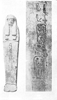 Although Sir Gaston was right in assuming that the chamber discovered in 1907 was not Tutankhamen’s tomb, his hypothesis that the latter might have been in the neighbourhood of his predecessor (Amenhotep III) and his successor (Ay) has been shown by Mr Howard Carter’s recent discovery not to be true. The chamber seems to have been nothing more than a safe (perhaps cut out by the workmen who were making a tomb for Horemheb) in which plunderers of the tombs of Tutankhamen and Ay hid their spoil. Why they were unable to rescue all the gold they stole and so hid away is not apparent. The chamber was buried at a depth of 25 feet and was almost filled with mud, which had been swept into it by the rain of many centuries. In this room was found a broken box containing several pieces of gold stamped with the names of Tutankhamen and his wife Ankhsenamen, and others bearing the name of his successor called the King’s Father-in-law Ay and his wife Tiy, but without any title or prenomen. In the mud was found the 38 very beautiful statuette made of fine translucent aragonite commonly called “alabaster.” Apart from its value as a wonderful work of art this figure is interesting as the broad scarf around the loins is tied in the Syrian fashion. Unfortunately there is no inscription on it. M. Daressy makes the tentative suggestion that it may represent Ay before his succession to the throne.