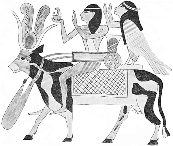 In the famous inscription upon the walls of the tomb of Seti I, to certain passages of which I referred in the last chapter, there is a remarkable story of the function of the Divine Cow Hathor or Nut as a means of104 raising the dead king to the sky to reach the home of the gods. After being rejuvenated by the goddess the king became oppressed with the boredom of life upon earth amongst his tiresome subjects, who had shown their disloyalty to him by referring to his old age and failing powers. So he decided to leave the earth and proceed to the sky. Hence he mounted upon the back of the cow and got to heaven, where he assumed his godhead by becoming identified with the sun.