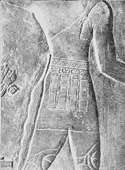 This function of the cow in acting as a vehicle to convey the mummy to its celestial home is one which was repeatedly depicted in the ancient Egyptian monuments. But the cow’s solicitude for the welfare of the dead was frequently shown in other ways. A favourite motif for the Egyptian sculptor was the representation of the Divine Cow, Hathor, protecting the dead king or permitting him to obtain an elixir of life by drinking milk from her udder. In his book Egyptian Art (1913) the late Sir Gaston Maspero devotes to this subject a whole chapter (XI) illustrated with six beautiful photographic plates of such cow-statues ranging from the time of Amenhotep II (1440 b.c.) to more than a thousand years later. But we know that the protective 105 function of the Cow Hathor was portrayed in other ways as early as the time of the Pyramid-builders (for example, the beautiful slate statuettes found by Professor Reisner in the Pyramid Temple of Mykerinus of the fourth dynasty, about 2800 b.c.), and the still earlier representation of her upon the slate palette of King Narmer of the first dynasty, about 3400 b.c. For several reasons this palette is a historical document of unique importance. Engraved upon it is the earliest example of 106 writing that has come down from antiquity: but it is of interest in connexion with the discussion in this chapter. For at the upper corners of the palette the cow-headed Hathor is depicted and as a further protection the king wears upon his belt four cows’ heads (Fig. 18) in place of the cowrie amulets of more primitive peoples.