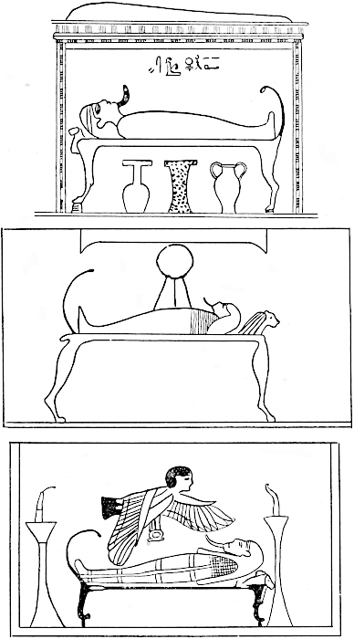 The same design occurs in the pictures illustrating the Book of the Dead. The funerary couch is usually represented in the lion-form, the cow- and hippopotamus-varieties being much less frequently adopted.