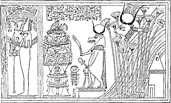To understand why the cow, of all creatures, should have been selected for this purpose, we must remember the relentless logic and persistency that inspired all the preparations of the tomb and its furniture. The mummification of the body and the elaborate arrangements for protecting it and ministering to its wants were due to the belief that the continuance of the deceased’s existence had been secured by these preparations. But to make doubly certain, no device that would contribute to the attainment of this aim was neglected. Inscriptions were made on the walls of the tomb, on the sarcophagus and coffins, and on papyri to ensure the identification of the deceased king with Osiris, so that he might be made to share the god’s fate. A figure of Osiris was made, as I have explained elsewhere (p. 61), out of the sacred barley, every grain of which was regarded as a model of the life-giving Great Mother, and as such a supply of vital essence to maintain the deceased’s existence. From time to time dramatic ceremonies were held at the tomb (or in the temple associated with it in far-off Thebes) to reanimate the dead and help him to persist.