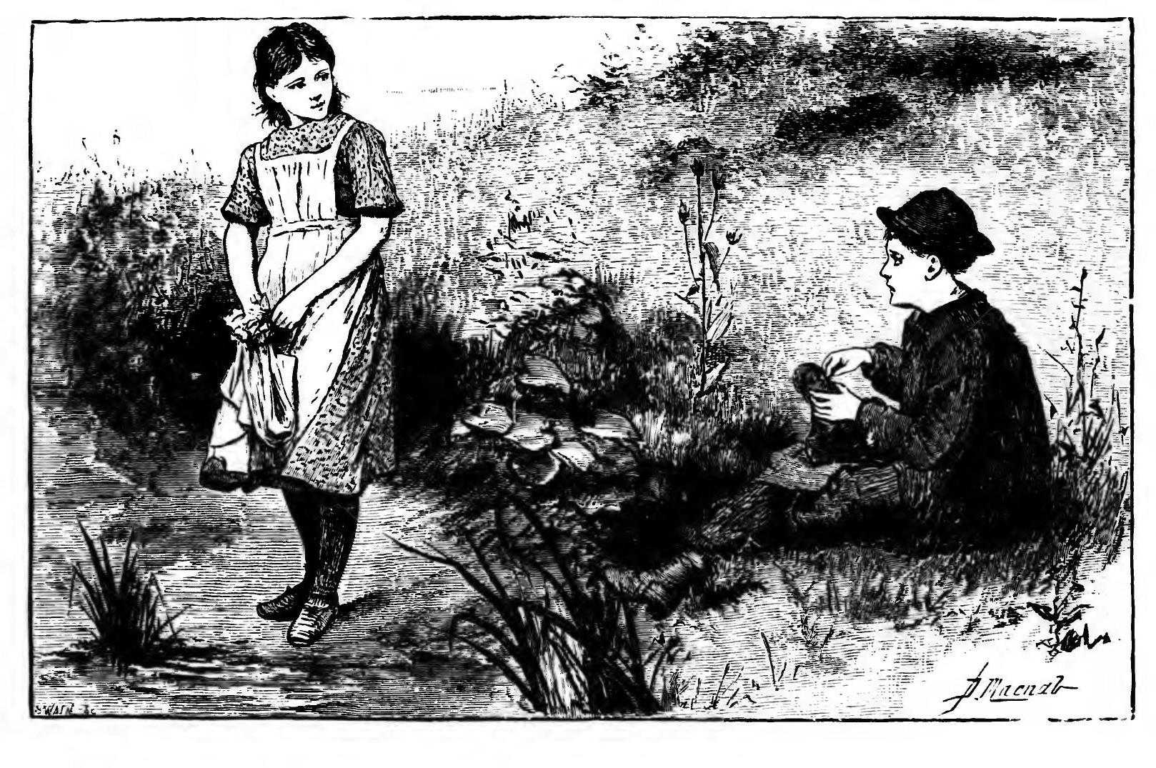 They had gathered flowers till they were tired of them in the broad spongy meadow; they had played hide-and-seek among the eighteenth-century tombstones in the big old churchyard; they had quarrelled and made it up again half a dozen times over in pure pettishness: and now, by way of a distraction, Minna said at last coaxingly: 'Do 'ee, Colin, do 'ee come down to the lake yonder and make I a bit of a vigger-'ead.'