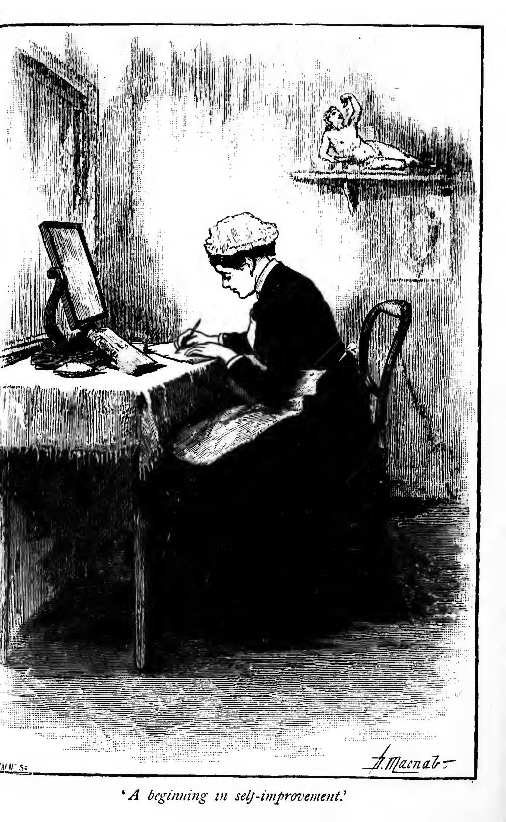 It wasn't a very exalted model of literary composition, that Complete Manual of Letter Writing, but at least its spelling and punctuation were immaculate; and for many months to come after she had secured her place as parlour-maid in an eminently creditable family in Regent's Park, Minna sat herself down in her own bedroom every evening, when work was over, and deliberately endeavoured to perfect herself in those two elementary accomplishments by the use of the Polite Correspondent's unconscious guide, philosopher, and friend. First of all she read a whole letter over carefully, observing every stop and every spelling; then she copied it out entire, word for word, as well as she could recollect it, entirely from memory; and finally she corrected her written copy by the printed version in the Complete Manual, until she could transcribe every letter in the entire volume with perfect accuracy. It wasn't a very great educational effort, perhaps, from the point of view of advanced culture; but to Minna Wroe it was a beginning in self-improvement, and in these matters above all others the first step is everything.