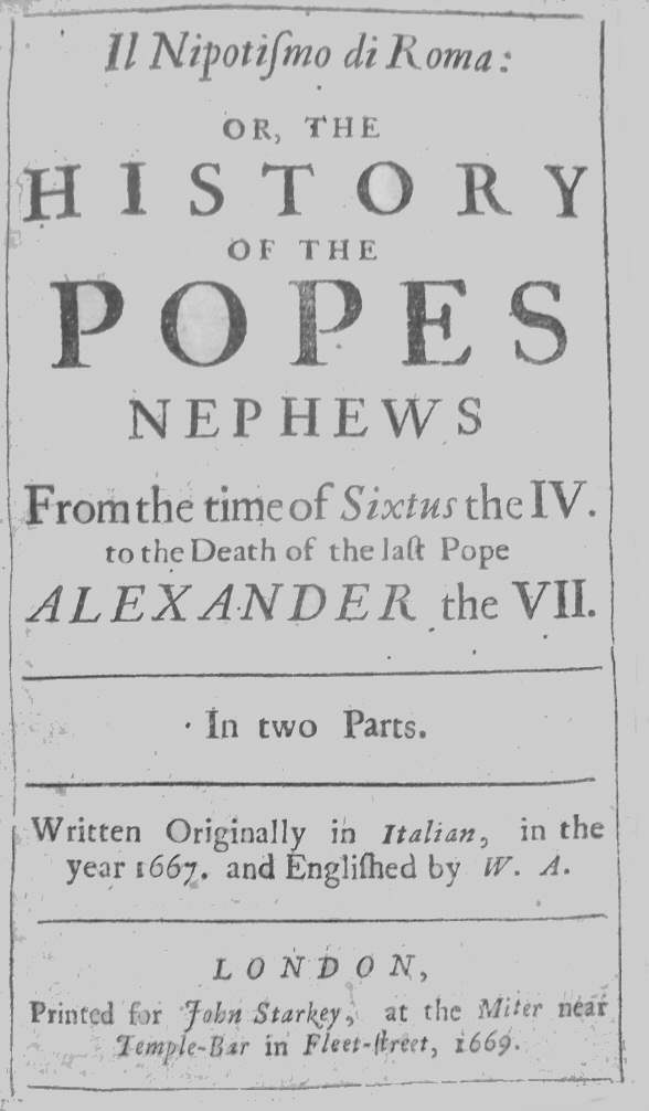 I should have much to say to thee, and not a few Ceremonies to Complement thee withall, if two Considerations did not make me resolve to hold my peace, and abstain from that courtship, which would become a Preface. The first is, because I will not (as the Proverb sayes) reckon without mine Hoste, and fill thy ears with excuses, before I know whether thy intention be to hear them or no. Secondly, because I think it will not be amiss to forbear Ceremonies in the presence of so many, whose business it hath been to be most accomplish’d in performing of them. What danger would there be for once, to let a Reader judge of a Book, without all those troublesome informations from the Author: For in a word, either the Reader hath parts and learning, and then his own judgment needs no instruction from the Authors; or he hath none, and is illiterate, and then the Author loses his time in p. viexcusing himself to one, whose abilities cannot reach his subject: But this our age being so far different from ancient times, wherein little notice was taken of the Author, though much of the thing written, it will be as just for him to inform his Reader, as for a Suppliant to inform his Judge, though never so learned, and to be recommended to him, though his case be never so just. A Friend of mine, calls the Advice to the Reader, the Sauce of the Book, because it is that part, which gives us a stomach to read the rest. I must confess, it is for his satisfaction that I give you mine; I know not how excellent it may prove to thy Palate: but my intention, is not, at least, to put too much Salt in it; and indeed, with what can I season it, or what Ingredients have I left to compound it withall? If I praise my own work, I shall incur the censure of an interested Judge; if I dispraise it, I shall do my self an injury. To tell thee that this Book comes from Rome is in vain, because the very Title of it discovers the place of its birth; and to entreat thee to read it, would be just the way to stifle thy curiosity; for now adayes, every body desires the reading of those Books which are prohibited; and I am certain, that it were a good way, to incite the publick curiosity of the world p. viifor any Books, to intreat them that they would be pleased to let them alone, for that, without doubt, would encrease their desire of seeing it. I think I had best do as those Hunters, who for fear of raising the Partridge too soon, talk to one another so softly, and so low, that they scarce hear themselves speak. Therefore, Reader, take notice, this is that famous Nipotismo di Roma, so much desired and wished for by all the ingenious of Europe, before it was brought forth by the Author. I give thee warning to read it in private, and keep it to thy self; for if the news of thy reading it come to the Inquisitors ears, without doubt thou runnest the hazard of an Excommunication; for they have sworn, to indure no Books in Italy, but those that shall flatter the Court of Rome. It is indeed a good policy for them, and for those Church men, who having pretensions to the highest Ecclesiastical Honours, stand all day before the Nipotismo with their Caps in their hands. I know, that in Rome this History will produce the same effect that our Nails do upon a Sore, that is, the more they scratch it, the worse they make it: Yet the itching pleases every body, and the more we scratch, the more we have a mind to scratch still. Neither do I doubt, but that there will be some p. viiiflatterers and false friends of the Nephews of the Popes, who will express their dislike of this Treatise; but it will be only in appearance, and not from their hearts, which may be forgiven them, for seldome in Rome do the Tongue and the Heart correspond.