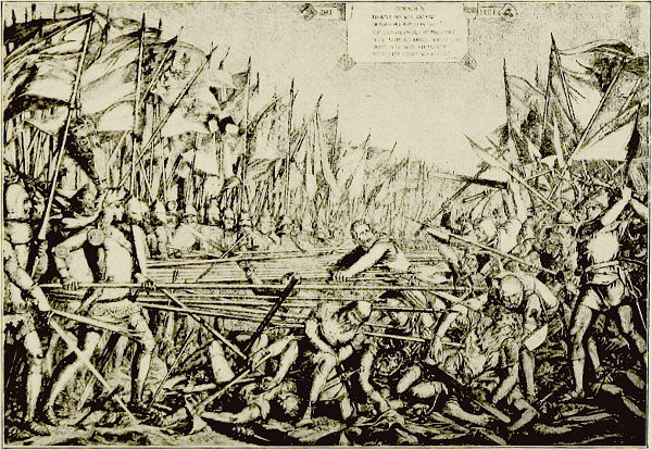 It was now midday. The sun beat fiercely down upon the heavily armored knights. Some in the middle ranks fainted; some died from suffocation. In all other ways the Austrian position was advantageous, for they occupied the higher point and could hurl themselves down upon the enemy. The Confederates, fearing the arrival of Bonstetten, rested a brief spell in the Meierholz and then advanced for immediate attack. They were between fifteen and sixteen hundred strong and were armed with swords, pikes, and halberds. Their leader, Schultheiss of Gundoldingen, formed them in wedge shape, the point toward the enemy. In this order they fell upon their knees and implored divine help. The haughty knights, supposing that they were begging for mercy, taunted them. They soon discovered their mistake, for hardly had they risen to their feet, before they rushed forward with a mighty shout and the fearful blasts of their battle-horns. The Lucerners formed the point of the wedge and attempted to force a way through the enemy, but the Austrians stood as immovable as a wall, helm to helm, mail to mail, shield to shield, and between the shields a forest of spears, which resisted the attack. The Urners next advanced. “Break down their spears; they are hollow!” shouted their leader; but the broken spears were replaced by those behind them, and the Urners gave way as the Lucerners had done. The brave Schwyzers fared no better, and in falling back suffered severe loss from the showers of arrows shot at them from behind hedges and bushes.
