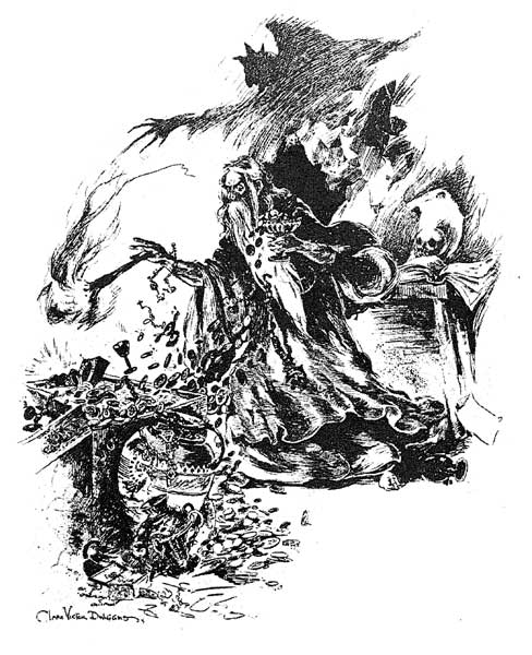 The Griffin, a lion with a vulture's beak, white wings, red paws, and blue neck—"I am the master of the profound splendours. I know the secret of the tombs where the old kings sleep. A chain, which issues from the wall, keeps their heads erect. Near them, in basins of porphyry, women whom they have loved float upon black liquids. Their treasures are ranged in halls, in lozenges, in hillocks, and in pyramids; and, lower, far below the tombs, after long journeys in the midst of suffocating darkness, are rivers of gold with forests of diamonds, meadows of carbuncles, and lakes[Pg 166] of quicksilver. With my back against the door of the vault, and my claws in the air, I watch with my flaming eyes those who may think fit to come there. The immense plain, even to the furthest point of the horizon, is quite bare and whitened with travellers' bones. For you the bronze doors will open, and you will inhale the vapour of the mines; you will descend into the caverns ... Quick! quick!"