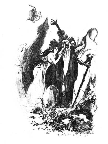 It is a death's-head with a crown of roses. It rises above the torso of a woman white as mother-of-pearl. Beneath, a winding-sheet, starred with points of gold, makes a kind of train;—and the entire body undulates, like a gigantic worm holding itself erect.