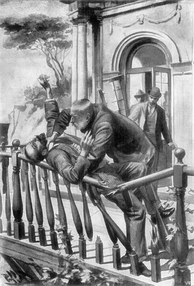 His voice located him, and before we could either of us stop him, Kitwater had sprung forward and clutched him in his arms. Of what followed next I scarcely like to think, even now. In cannoning with Hayle he had dropped his knife, and now the two stood while a man could have counted three, locked together in deadly embrace. Then ensued such a struggle as I hope I shall never see again, while we others stood looking on as if we were bound hand and foot. The whole affair could not have lasted more than a few moments, and yet it seemed like an eternity. Kitwater, with the strength of a madman, had seized Hayle round the waist with one arm, while his right hand was clutching at the other's throat. I saw that the veins were standing out upon Hayle's forehead like black cords. Do what he could, he could not shake off the man he had so cruelly wronged. They swayed to and fro, and in one of their lurches struck the window, which flew open and threw them into the balcony outside. Codd and the Sicilian police official gave loud cries, but as for me I could not have uttered a sound had my life depended on it. Hayle must have realized his terrible position, for there was a look of abject, hopeless terror upon his face. The blind man, of course, could see nothing of his danger. His one desire was to be revenged upon his enemy. Closer and closer they came to the frail railing. Once they missed it, and staggered a foot away from it. Then they came back to it again, and lurched against it. The woodwork snapped, and the two men fell over the edge on to the sloping bank below. Still locked together they rolled over and over, down the declivity towards the edge of the cliff. A great cry from Hayle reached our ears. A moment later they had disappeared into the abyss, while we stood staring straight before us, too terrified to speak or move.