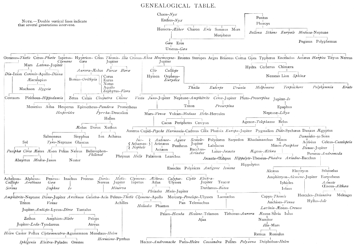 The transcription of the genealogical table has been added by the transcriber for the convenience of the reader. Please note that the original table stated erroneously that Hemera was male and Æther was female. This has been corrected in the transcription.