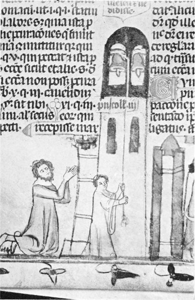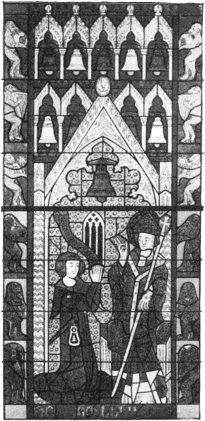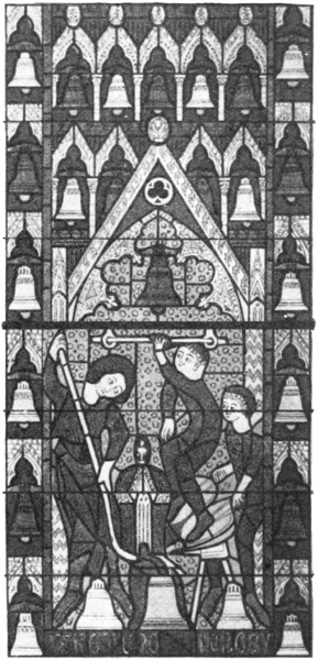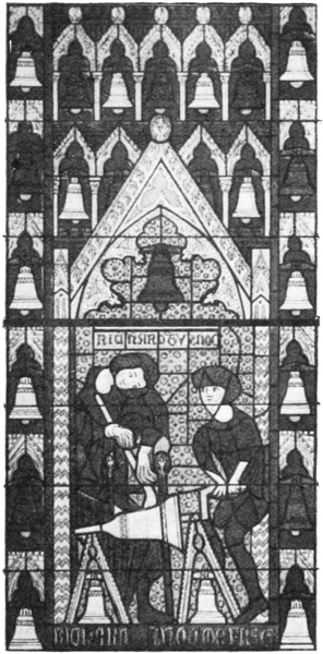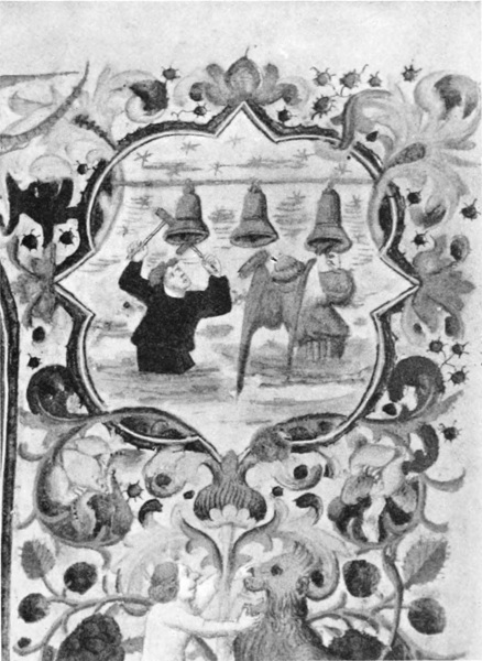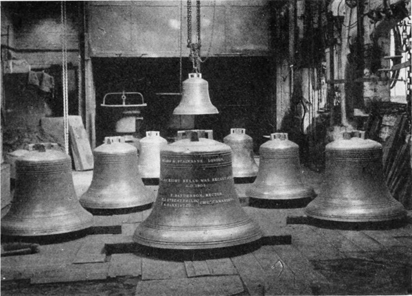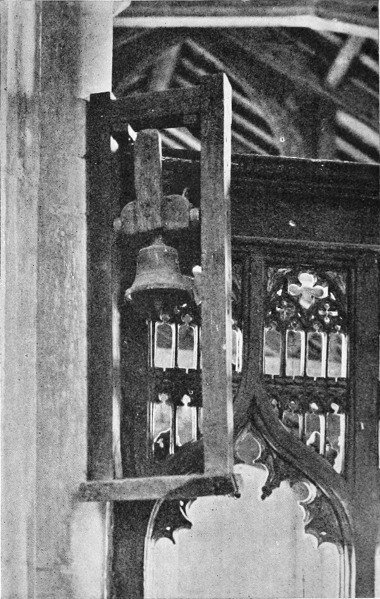 I speak of “rings of bells”—and that is a more correct term than “peal,” which refers to the sound they make—but it must be remembered that in those days bells were not rung as in modern times. At best they were “chimed,” i.e., sounded without being rung up; but change-ringing, which implies the full swinging round of the bell through a complete circle, so that the clapper strikes twice in each revolution, was only introduced in the seventeenth century, and moreover has always been peculiar to this country.