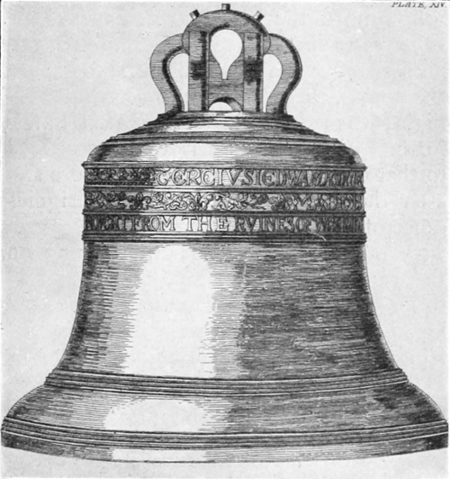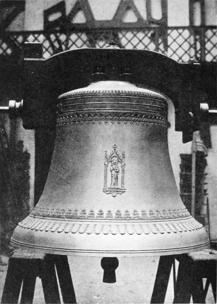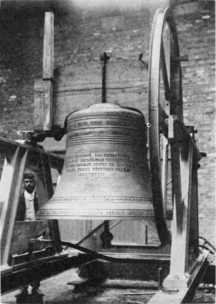 Ancient bells were invariably dedicated with elaborate ceremonies, and were baptized with the name of the saint or other person after whom they were named (Plate 4). The bells at Croyland, just mentioned, were named Pega, Bega, Turketyl, Tatwin, Bartholomew, Betelin, and Guthlac. There is, however, much disputing as to the exact ceremonies employed, some authorities maintaining that bells were neither baptized nor even “washed,” but merely blessed and consecrated, so as to be set apart from all secular uses.