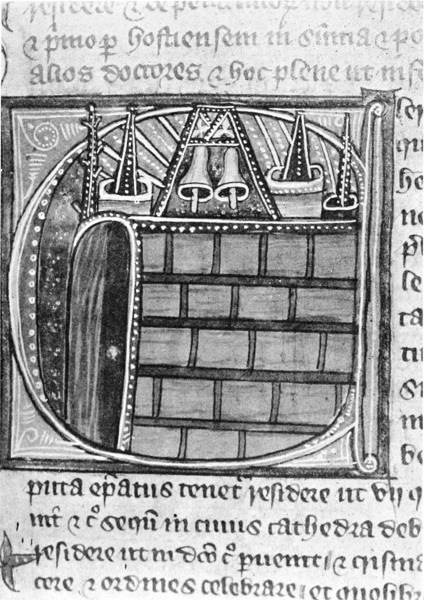 Several ancient manuscripts have pictures which throw light on the use of bells in early times, as, for instance, one which depicts a performer on a row of small “hand-bells” suspended from an arch,[Pg 6] which he strikes with a hammer (Plate 2). Another portrays King David engaged in a similar act (Frontispiece); and others give representations of church towers or turrets with bells hanging in them, apparently without wheels or ringing arrangements (Plate 3). In the Bayeux tapestry there is a representation of the funeral of Edward the Confessor, in which the corpse is accompanied by two boys, each ringing a pair of hand-bells.