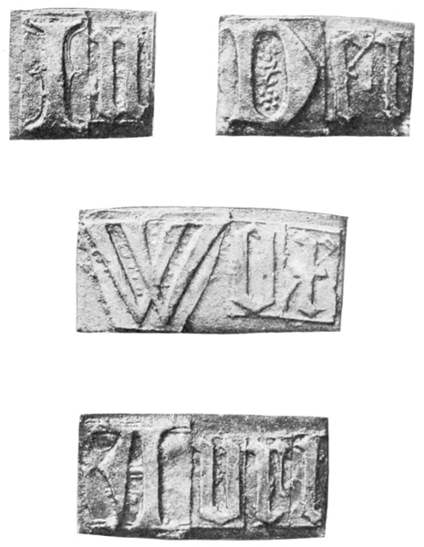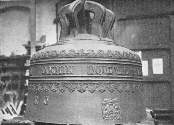 Inscriptions and ornaments are produced in relief on the bell from stamps, also in relief, which are pressed into the mould, making a hollow impression in it. Copies of coins were often produced in this way by the older founders. Down to about the end of the seventeenth century each letter, or sometimes each word, was placed on a separate patera or tablet of metal. The usual place for the inscription is just below the “shoulder”-angle; but modern founders prefer the middle or “waist.”