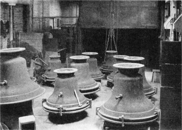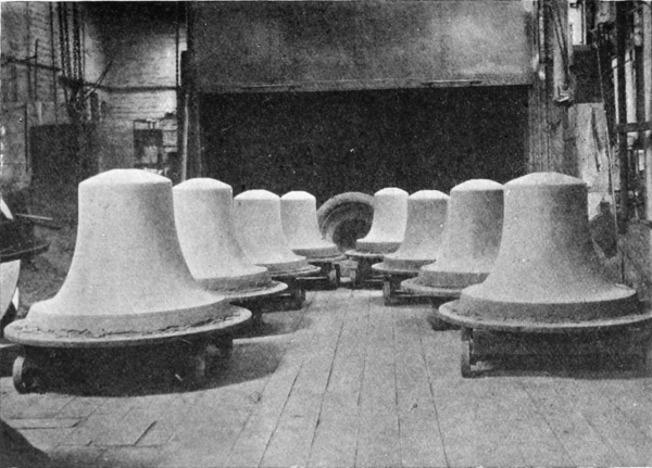 The process of casting a bell, as employed both by ancient and modern founders, may be described somewhat as follows:—The first business is the construction of the core, a hollow cone of brick somewhat smaller than the inner diameter of the intended bell, over which is plastered a specially-prepared mixture of clay, bringing[Pg 13] it up to the exact size and shape of the interior of the bell. This was usually modelled with the aid of a wooden “crook,” something like a pair of compasses; but is now done with an iron framework called a “sweep,” which revolves on a pivot and moulds the core by means of metal blades. This clay mould is then baked hard by means of a fire lighted within it. The next stage was the construction of the cope or outer casing of the mould, which used to be also made in hard clay, its inner surface following the outer shape and dimensions of the bell. The “thickness” of the bell itself, i.e., the part to be occupied by the molten metal, was formed in a friable composition which was laid over the core and then destroyed. In modern times the “thickness” has been dispensed with, the cope being formed by lining a casing of cast iron with clay shaped to the external form and dimensions of the bell. The mould is now complete, except for providing for the cannons or metal[Pg 14] loops which attach the bell to the stock, and the loop to which the clapper is suspended inside. Every care having been taken to adjust the respective positions of the cope and core with exactness, the molten metal is then poured in through an opening, and left to cool, after which the bell comes out complete. The process is analogous to that known as cire perdu, employed by sculptors for the casting of bronze statues. Illustrations of the moulding processes are given in Plates 6–10.