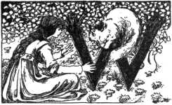 "I have not yet sinned," said the prince, "and do not intend to sin!" And then he pushed the boughs aside; there she lay already asleep, and lovely as only the fairy of the Garden of the World is privileged to be. She smiled in her dreams; yet as he bent over her, he saw tears trembling between her eyelashes.