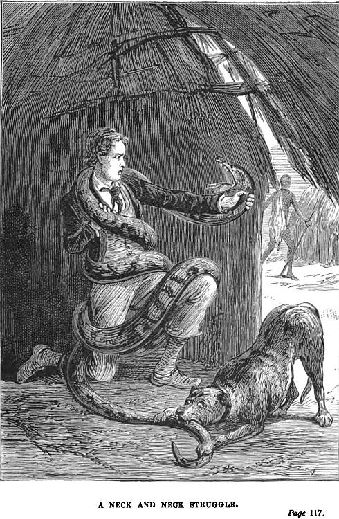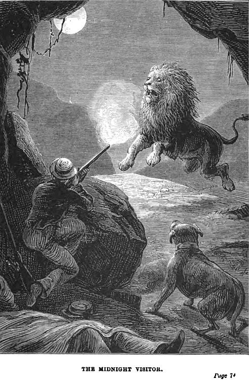 “So you did, I dare say; but he must have contrived to swim ashore. Anyhow, we met him two days’ journey from the Bechuana village, tracking us, I fancy, by his instinct, and he would have joined us there before long, if I had not fallen in with him; but he would not leave me, when we had once met, and I thought the best thing under the circumstances would be to take him with me to Cape Town. But Kama, who had never seen an animal like him, and who had heard of his having been swept away by the torrent, believed, I am convinced, that he was a sort of tutelary spirit, who would be sure to detect any knavery and avenge any false dealing on his part. It amused me, I must say, a good deal; but any way, from the day Lion joined our company to that on which we reached Cape Town, he never attempted any tricks.”
