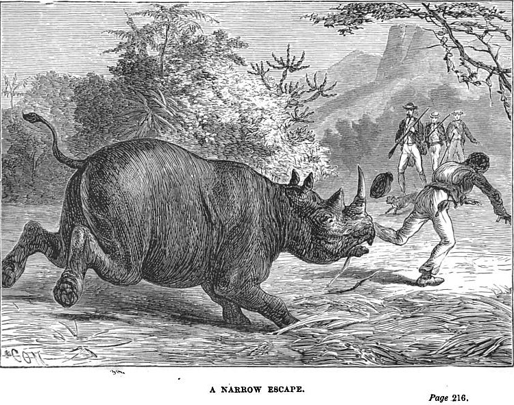 It was on the afternoon of the ninth day, when Kobo, who, it should be mentioned, had formed a warm friendship with Lion since leaving the Basuto village—it was just in the late afternoon, when Kobo, who had been a little in advance of the rest of the party, came hurrying back with the news, that there were both hoof marks and large stains of blood to be seen in the grass and bushes about a hundred yards ahead, as though some large animal—a gnu, or an eland, or perhaps a buffalo—had been severely wounded. If such was the case, most probably they were in the neighbourhood of the English lads, as there were neither Bechuanas or Basutos to be found thereabouts. He added, that it was with the greatest difficulty that he could restrain Lion, who wanted to rush off, at the top of his speed, in the direction of the footmarks.