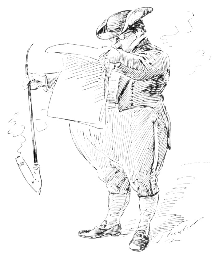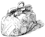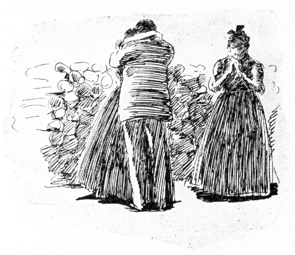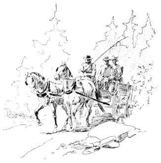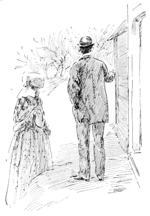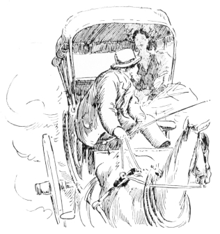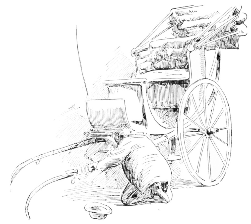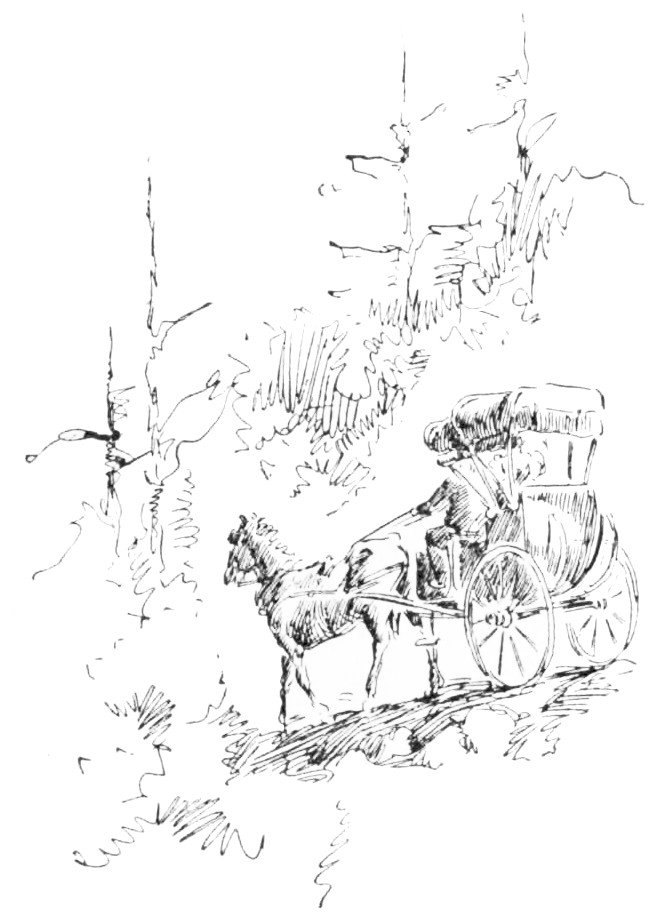 In the warm dusk of a Summer’s evening, a limping, shackle-gaited, bewildered horse, dragging a calash in the last stages of ruin, brought two travelers into the village of Byram’s Pond. Far up on the hills there lingered yet the clouds of dust that marked where that calash had come down those hills at a pace whereat no calash ever came down hill before. Dust covered the two travelers so thickly, that, although the woman’s costume was of peculiar and striking construction, its eccentricities were lost in a dull and uniform grayness. Her bonnet, however, would have excited comment. It had apparently been of{210} remarkable height; but pounding against the hood of the calash had so knocked it out of all semblance to its original shape, that with its great wire hoops sticking out “four ways for Sunday,” it looked more like a discarded crinoline perched upon her head than any known form of feminine bonnet.