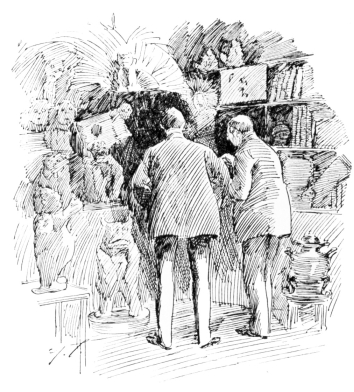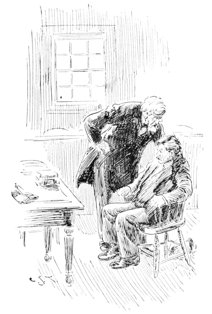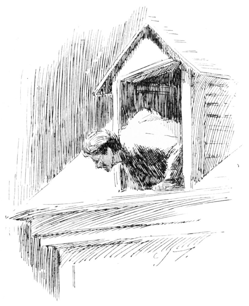 But of all the noises that startled Mr. Brimmington, in the first week of his sojourn in the farm-house, the most alarming awakened him about eight o’clock of the following morning. Hurrying to his study, he gazed in wonder upon a scene unparalleled even in the History of Prehistoric Man. The boards had been ripped off the curious structure which was supposed to have served the hardy settlers for a wall-bench and a dresser, indifferently. This revealed another structure in the form of a long crib or bin, within which, apparently trying to back out through the wall, stood Mr. Skinner, holding his tool-box in front of him as if to shield himself, and fairly yelping with terror. The front door was off its hinges, and there stood Mrs. Sparhawk wielding a broom to keep out the white horse, who was viciously trying to force an entrance. Mr. Brimmington asked what it all meant; and Mrs. Sparhawk, turning a desperate face upon him, spoke with the vigor of a woman who has kept silence too long.