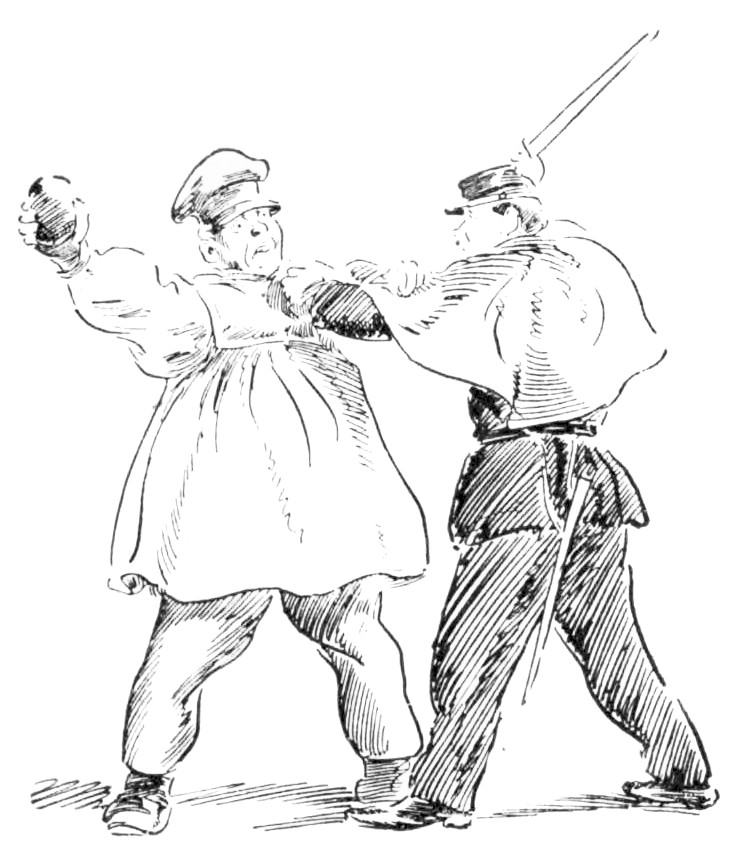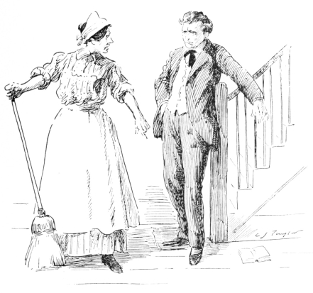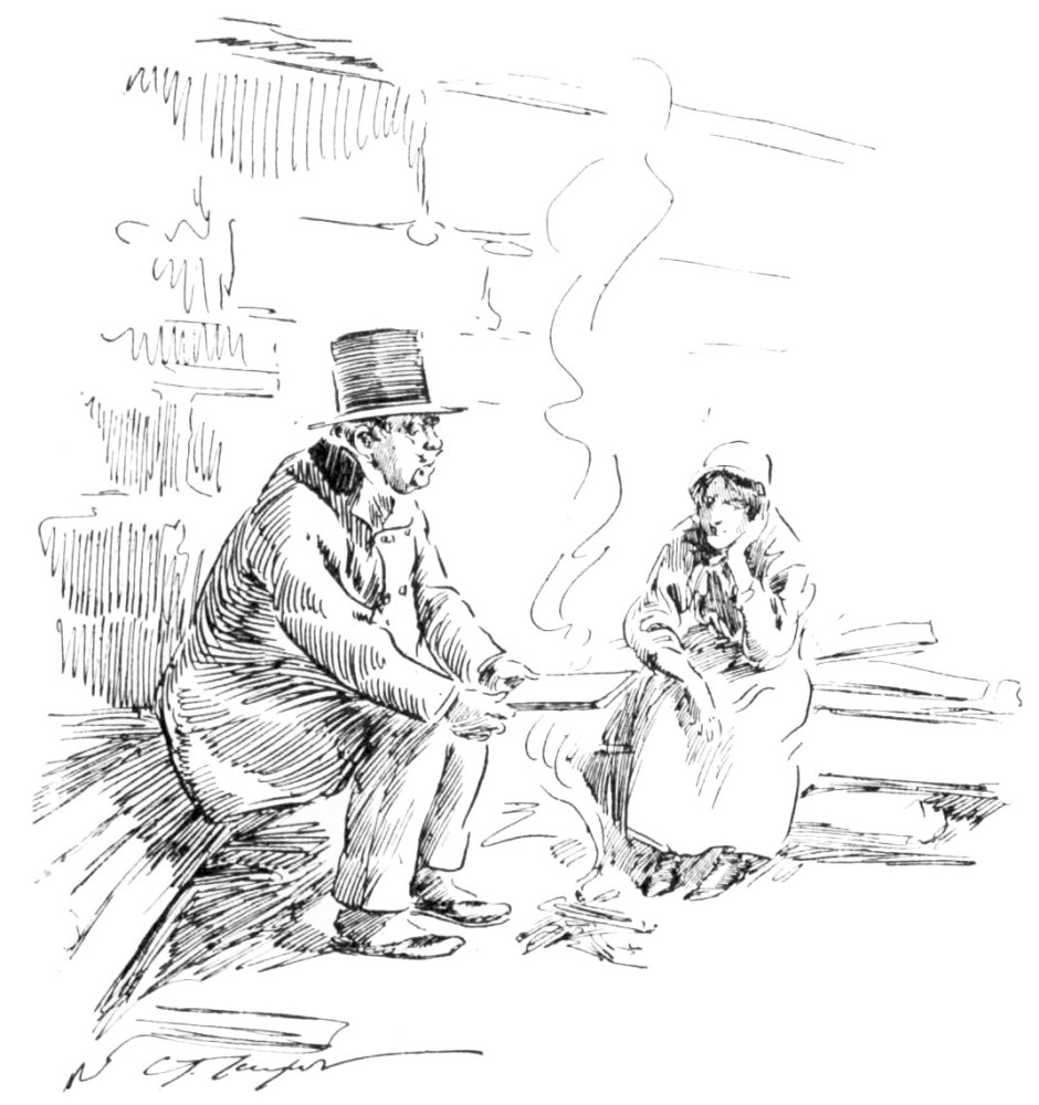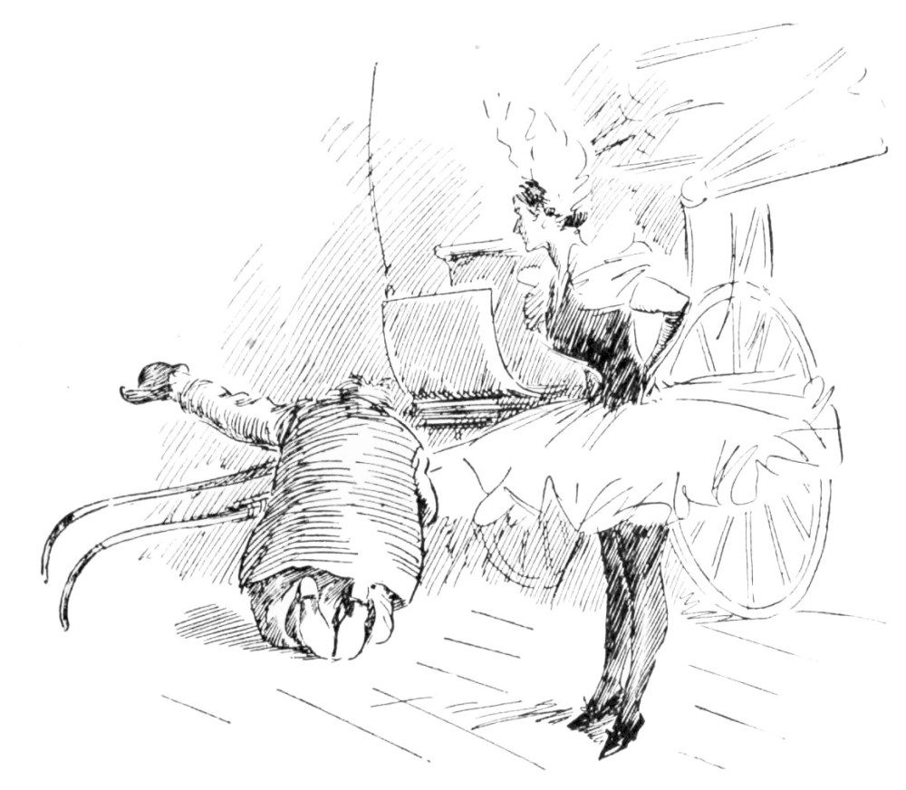 “I ain’t no Sparhawk!” fairly shouted the enraged woman, as with a furious shove she sent the Cumbersome Horse staggering down the door{20}way mound; “this here’s Hiram Skinner, the meanest man in Pike County, and I’m his wife, let out to do day’s work! You’ve had one week of him—how would you have liked twenty years?”{21}