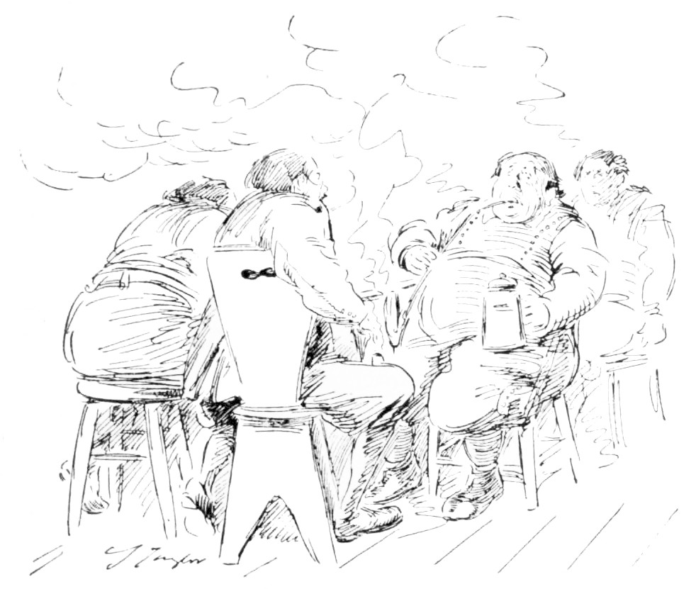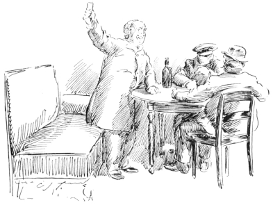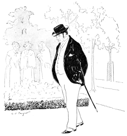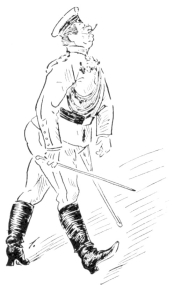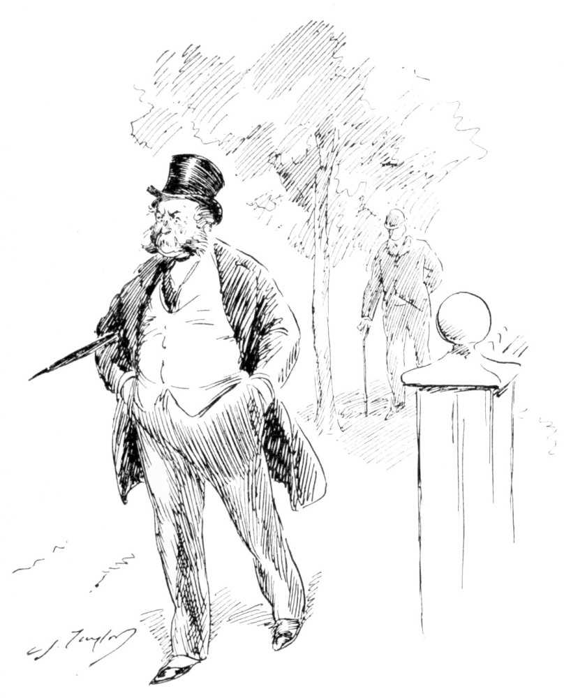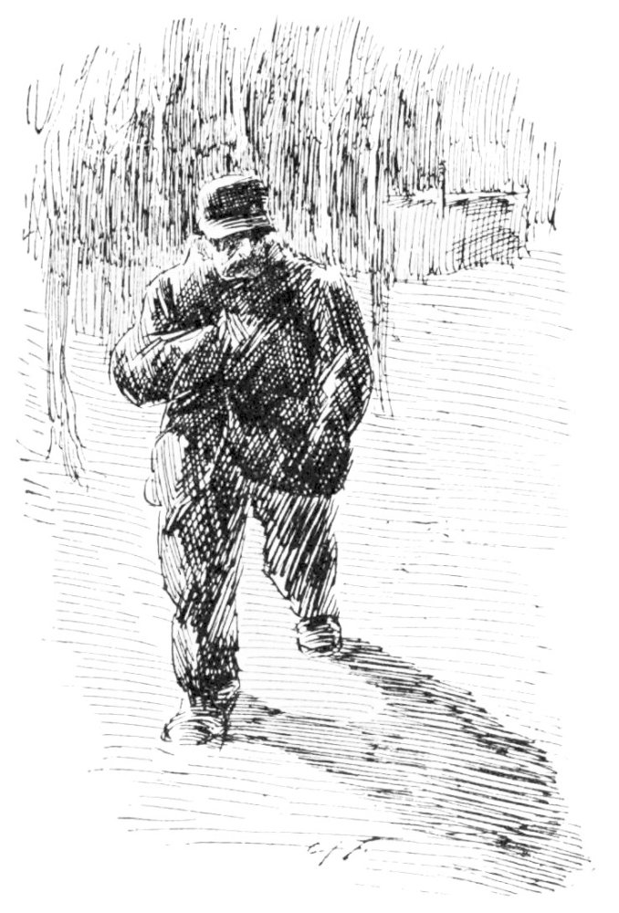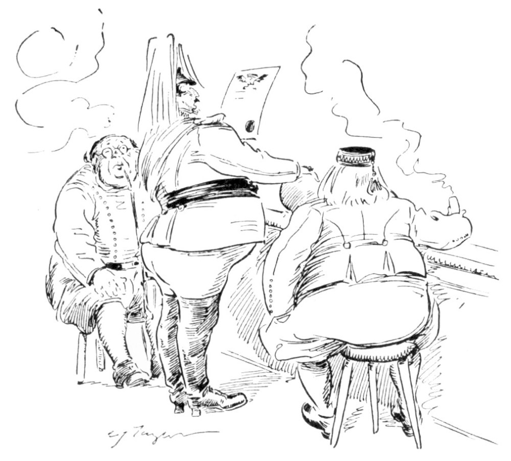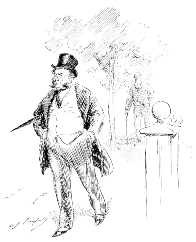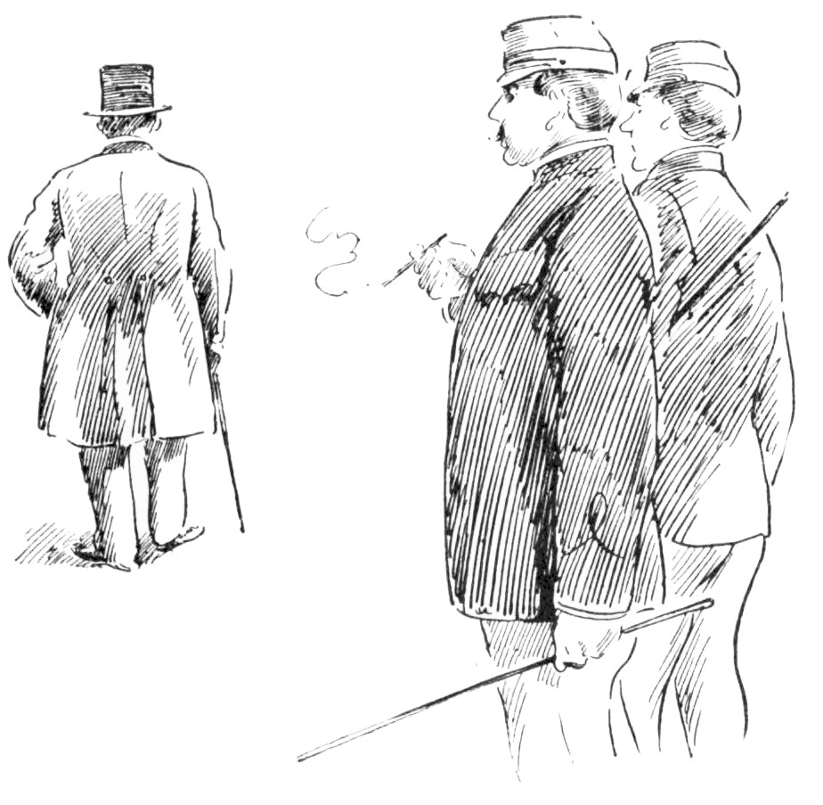 Such was Mr. Vincent Egg, after a half-century of struggle with the world; and something of an imposing figure he made, too, in his defeat and degradation. His nose was red, his cheeks were puffed and veined, there were bags under his bloodshot eyes, his close-cropped hair was thin, his stubby little gray moustache, desperately waxed at the ends, gave an incongruously foreign touch to his decidedly Anglo-Saxon face—and his clothes were shockingly shabby. But then he wore his clothes, as few men in our day can wear clothes; and they were his clothes; his very own, and not another’s. People often spoke of him, after seeing him once, as “that big, soldierly-looking old man in the white hat.” But he did not wear a white hat. His hat, which was one of the largest, one of the jauntiest and one of the oldest ever seen, had also been,{26} in its time, one of the blackest. It was his coat that gave people an idea of his having something about him that suggested white. It was a tightly-buttoned frock-coat of an indescribable light-dirty color. Most hopelessly shabby men cling to some standard of taste in dress that was the standard in their last-remembered days of prosperity. That coat—if it were one coat and not only one of a long-lived family—marked the fact that the last season of prosperity Mr. Egg had enjoyed was a season, now some twenty years gone, when the London “swells” or “nobs,” or whatever they called them then, wore frock-coats of certain fashionable light shades of fawn and mouse-color, then known, I believe, as “London Smoke” and “French Gray.” While it can not be said that Mr. Egg’s coat was familiar in every quarter of Europe (for it rarely staid long enough in any one place), it had certainly been seen in all. And more than one Austrian officer, after passing Mr. Egg in that garment of pallid, dubious and puzzling hue, had turned sharply around to satisfy himself that it was not a uniform-coat in a condition of profanation. A certain state and dignity that still clung to this coat, and the startling cleanness of his well-scissored cuffs and collars were all that remained to give Mr. Egg a hold upon exterior respectability.