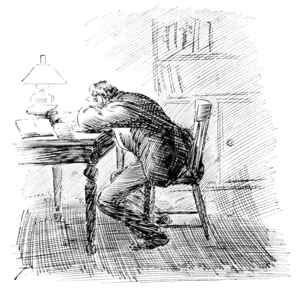 So pleased was Mr. Brimmington at his theory that the morning passed rapidly away, and when he looked at his watch he was surprised to find that it was nearly noon. Then he remembered that Mr. Skinner had promised to call on him at eleven, to make anything right that was not right. Glancing over the landscape he saw Mr. Skinner approaching by a circuitous track. He was apparently following the course of a snake fence which he could readily have climbed. This seemed strange, as his way across the pasture land was seemingly{12} unimpeded. Thinking of the pasture land made Mr. Brimmington think of the white horse, and casting his eyes a little further down the hill he saw that animal slowly and painfully steering a parallel course to Mr. Skinner, on the other side of the fence. Mr. Skinner went out of sight behind a clump of trees, and when he arrived it was not upon the side of the house where Mr. Brimmington had expected to see him appear.
