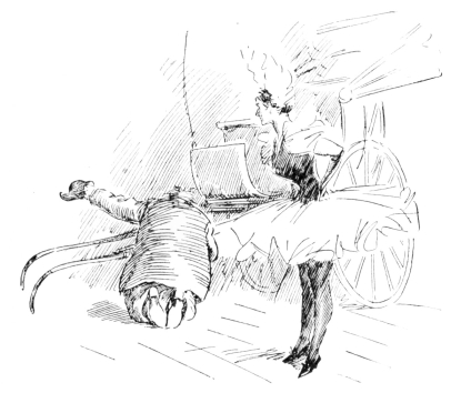 As he stood there and gazed out into the twilight, two forms suddenly approached him. Around one corner of the house came Mrs. Sparhawk on her way home. Around the other came an immensely tall, whitish shape, lumbering forward with a heavy tread. Before he knew it, it had scrambled up the side of his mound with a clumsy, ponderous rush, and was thrusting itself directly upon him when he uttered so lusty a cry of dismay that it fell back startled; and, wheeling about a great long body that swayed on four misshapen legs, it pounded off in the direction it had come from, and disappeared around the corner. Mr. Brimmington turned to Mrs. Sparhawk in disquiet and indignation.