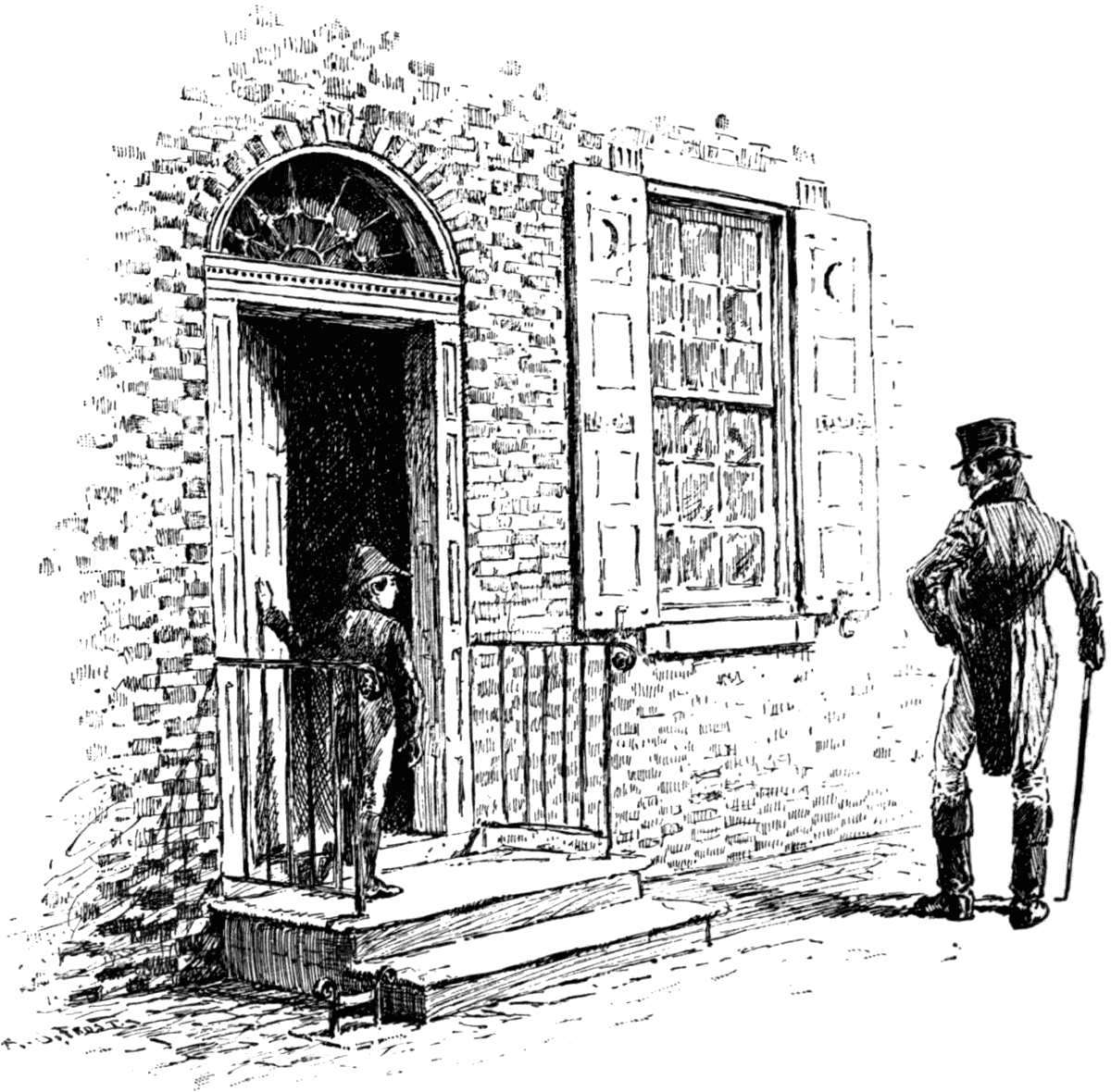 When the white-haired old lady who sat in this coach, with a very little girl by her side, saw Mr. Dolph and his son, she leaned out of the window and signalled to the old periwigged driver to stop, and he drew up close to the sidewalk. And then Mr. Dolph and his son came up to the window and took off their hats, and made a great low bow and a small low bow to the old lady and the little girl.[12]