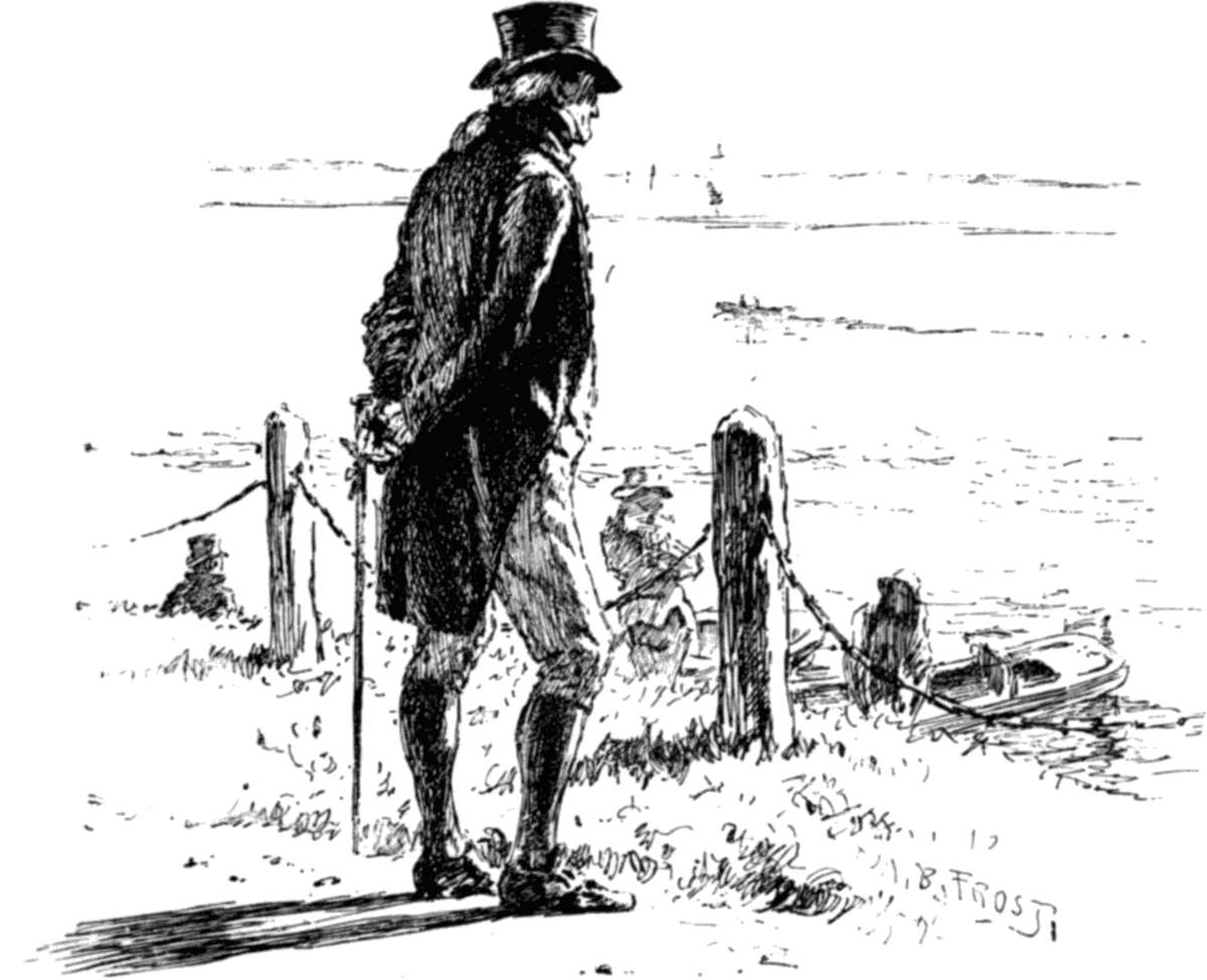 Jacob Dolph at this moment was setting forth from his house in State Street, whose pillared balcony, rising from the second floor to the roof, caught a side glance of the morning sun, that loved the Battery far better than Pine Street. He had his little boy by the hand[9]—young Jacob, his miniature, his heir, and the last and only living one of his eight children. Mr. Dolph walked with his stock thrust out and the lower end of his waistcoat drawn in—he was Colonel Dolph, if he had cared to keep the title; and had come back from Monmouth with a hole in his hip that gave him a bit of a limp, even now in eighteen-hundred-and-seven. He and the boy marched forth like an army with a small but enthusiastic left wing, into the poplar-studded Battery. The wind blew fresh off the bay; the waves beat up against the seawall, and swirled with a chuckle under Castle Garden bridge. A large brig was coming up before the wind, all her sails set, as though she were afraid—and she was—of British frigates outside the Hook. Two or three fat little boats, cat-rigged, after the good old New York fashion, were beating down toward Staten Island, to hunt for the earliest blue-fish.