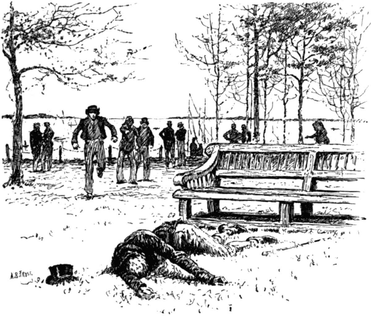 There was no sleep for any one of the little household in the great house on the night of the 14th of July, 1863. Doors and blinds were closed; only a light shone through the half-open slats at a second-story window, and in that room Aline lay sick, almost unto death, her white hair loosed from its usual dainty neatness, her dark eyes turning with an unmeaning gaze from the face of the little girl at her side to the face of her husband at the foot of her bed. Her hands, wrinkled and small, groped over the coverlet, with nervous twitchings, as every now and then the howls or the pistol-shots of the mob in the streets below them fell on her ear. And at every such movement the lips of the girl by her pillow twitched in piteous sympathy. About half-past twelve there was sharp firing in volleys to the southward of them, that threw the half-conscious sufferer into an agony of supersensitive disturbance.[131] Then there came a silence that seemed unnaturally deep, yet it was only the silence of a summer night in the deserted city streets.