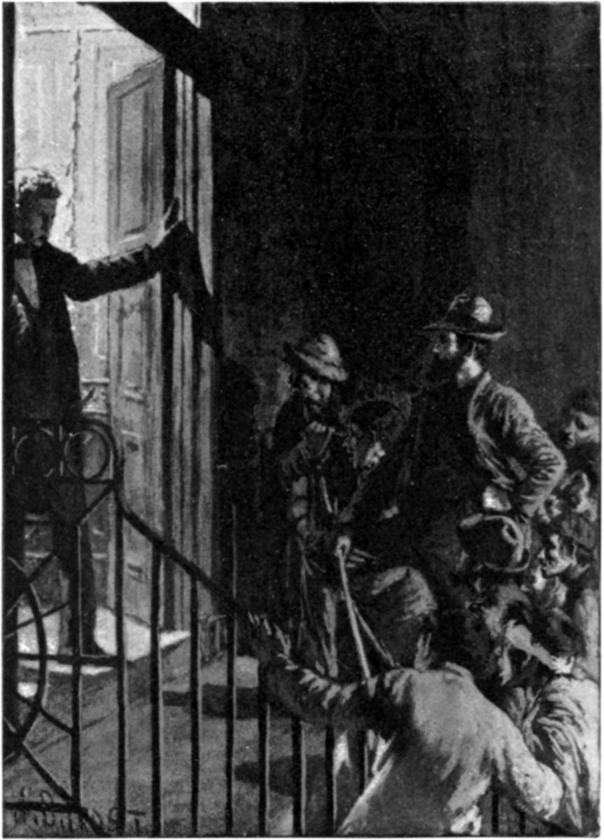 The door opened, and the white-haired old gentleman, erect, haughty, with brightening eyes, faced the leader of the mob—a great fellow, black-bearded, who had a space to himself on the stoop, and swung his broad shoulders from side to side.