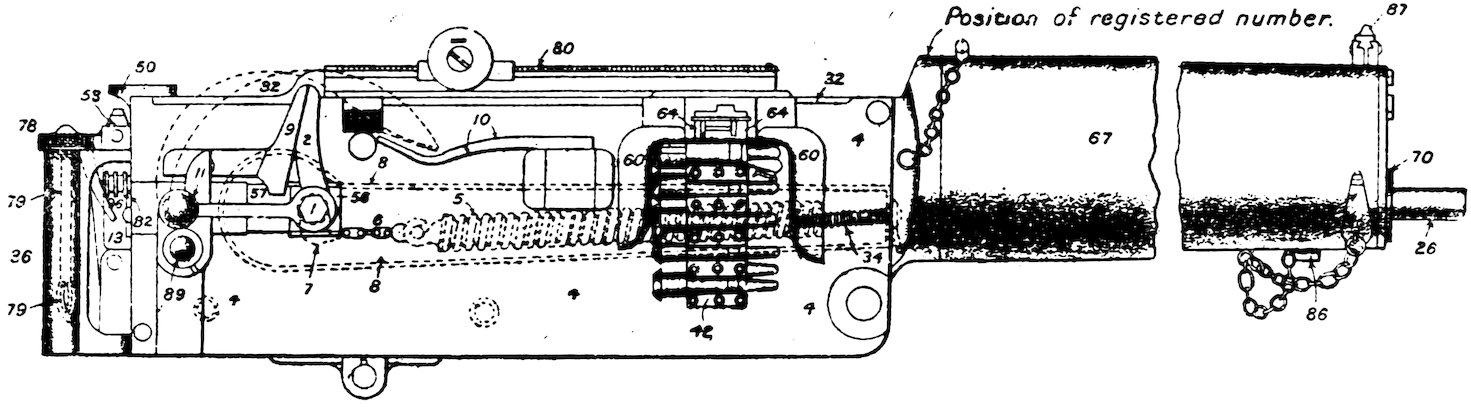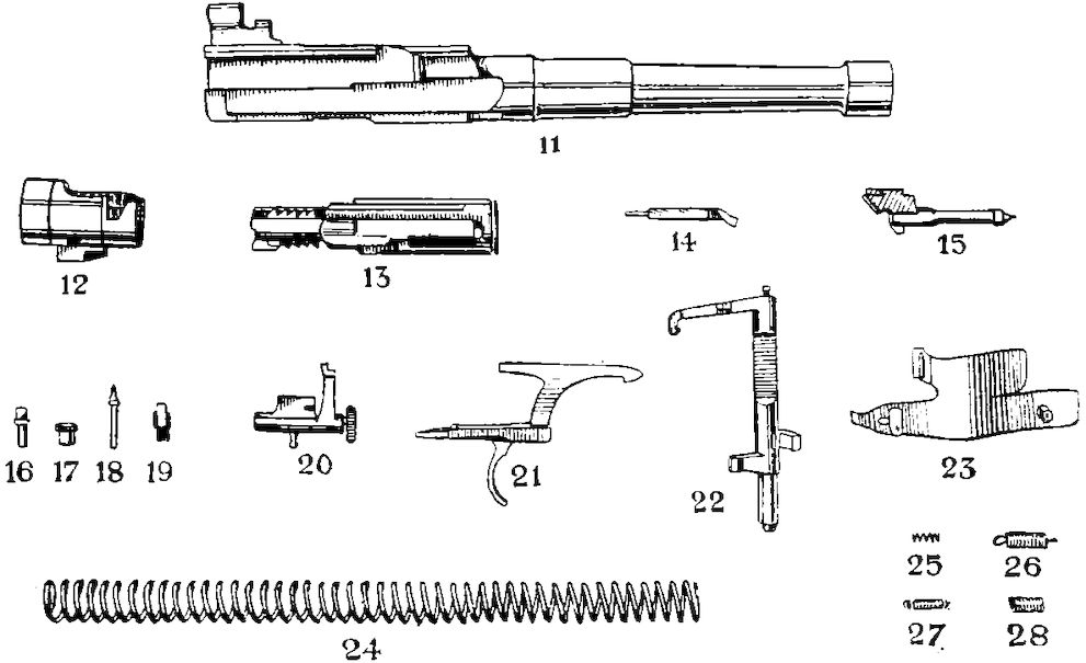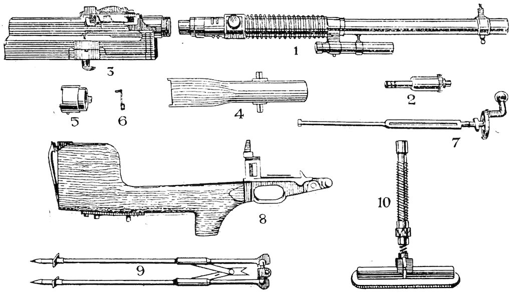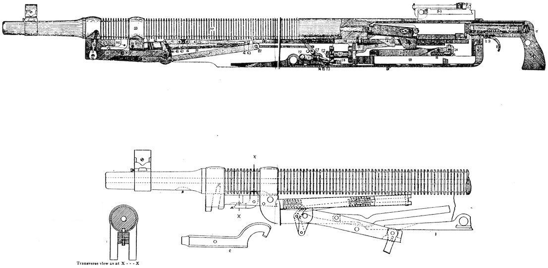 The gun may be considered as divided into two portions—the non-recoiling and the recoiling. It is worked automatically by two forces—the explosion of the charge which forces the recoiling portion backwards, and a strong spring (called the fusee spring) which carries it forward.