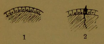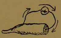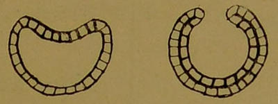 The way in which protoplasm gets its chemical requisites for growth is doubtless simply by absorbing them. Some of the lower structureless forms carry this to an absurd extreme, for when two individuals meet they fuse, and each no doubt claims to have eaten the other. As, moreover, the first thing which a cell does when it grows is to divide, the whole proceeding looks rather futile. But ready-made protoplasm of an assimilable shape is rare, and it is not often that a cell, unless it be a plant or a parasite, finds itself in a substance which can be handed straight to the nucleus without further elaboration. Usually the cell has to discharge from itself a reagent, which will develop the right chemical qualities in the matter it wants to absorb. This substance is known as an enzyme, or ferment. Ferments, however, are an expense to the cell, requiring a certain effort for their production; so, in order that they may be economized, they are, in the higher forms, poured over the food while it is in an enclosed cavity, or stomach. In[16] the simplest animals, consisting of a single cell, the protoplasm simply flows round the particle of food, and it is ‘ingested’ with a drop of water. Into this ‘food vacuole’ the ferments are secreted, and when all that is useful has been dissolved out and absorbed, the bubble moves to the surface and bursts; or, to put it differently, the cell flows on its way, and the vacuole, with any shell or refuse it may contain, gets left behind. (See Diagram 1.) In other cells which are constant in shape there is an opening leading to the interior of the cell. Round this there are little projecting threads, which beat the water regularly. In some positions these threads enable the cell to swim, but here their duty is to cause a current and wash particles of food down the primitive throat into the interior, where, as in the preceding case, they become enclosed in a vacuole. (See Diagram 2.)